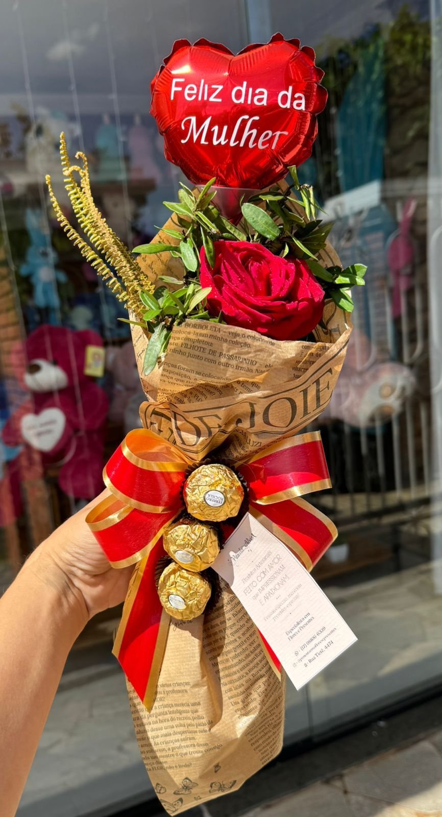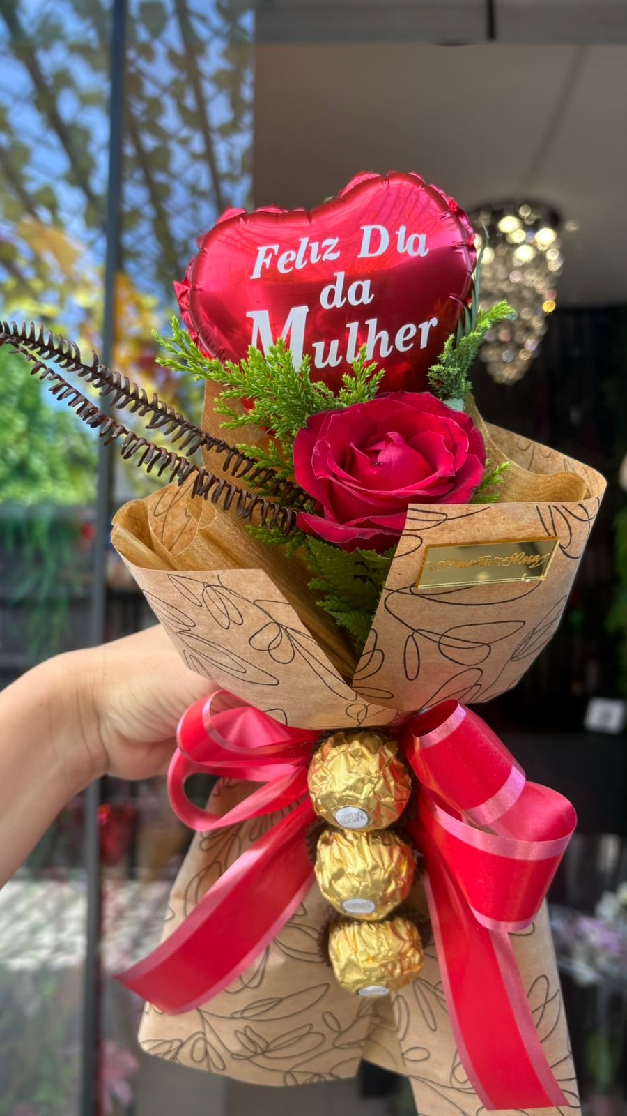 Este arranjo contém: 1 rosa, trio Ferrero Rocher e mini balão.