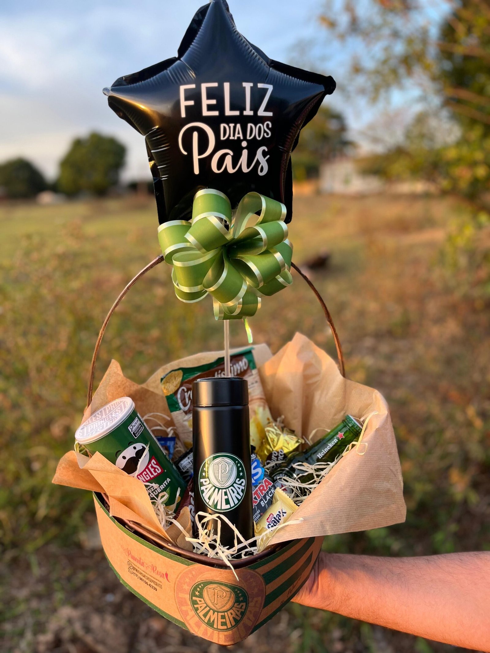 Esta cesta contém: batata Pringles, refrigerante ou cerveja, garrafa térmica com medidor de temperatura, chocolates e balão personalizado.