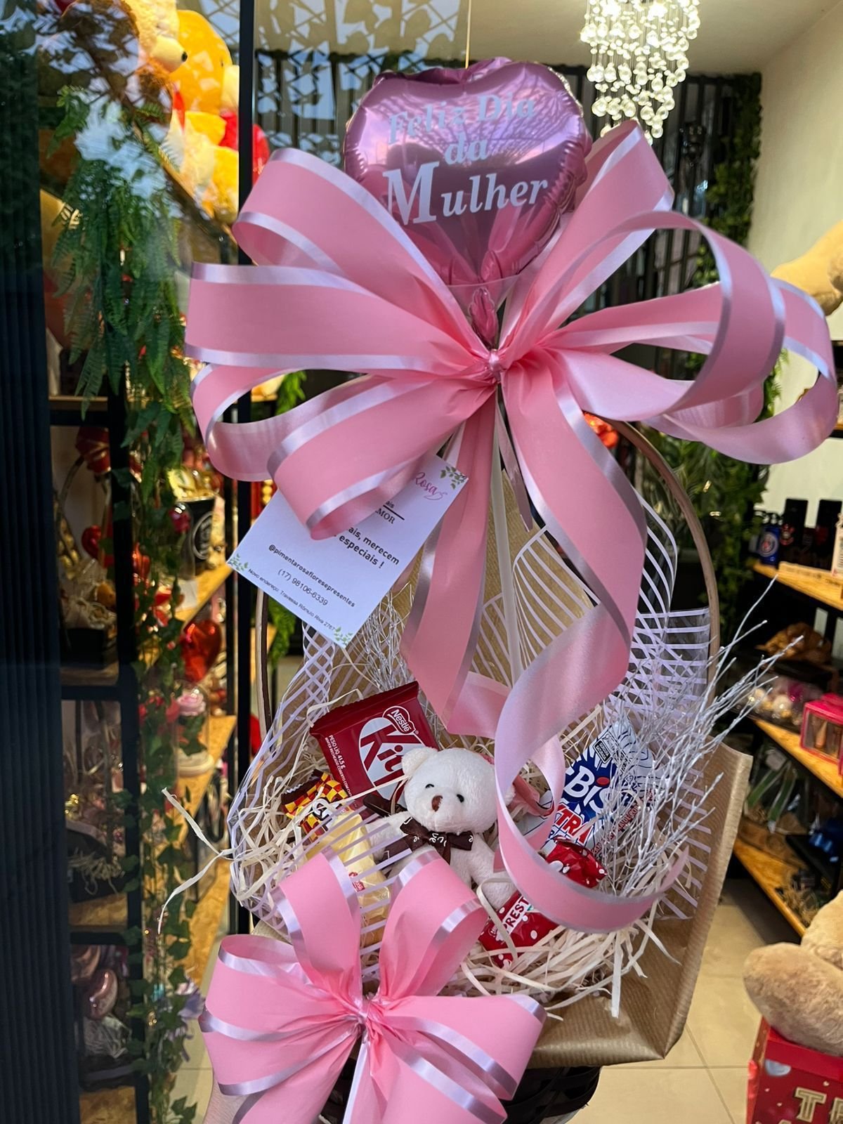 Esta cesta contém: Chocolates variados, mini pelúcia e balão grande.
