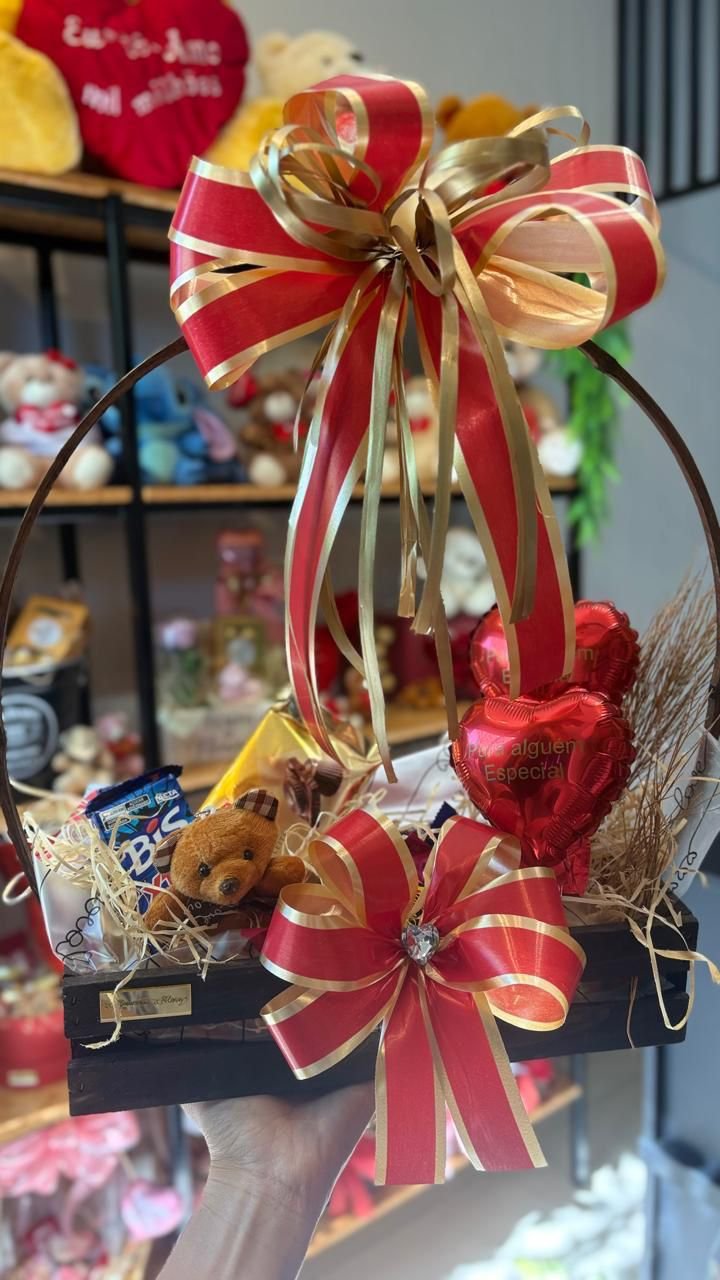 Cesta Luxo 3 com chocolates variados, mini pelúcia e balão personalizado.