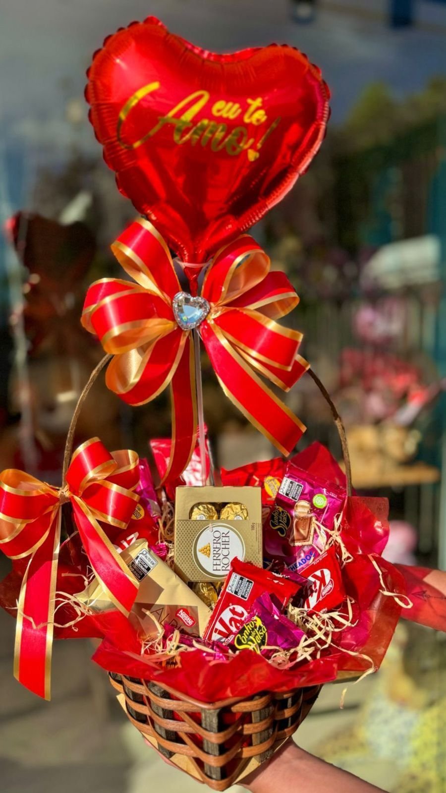 Esta cesta contém: Chocolates variados, Ferrero Rocher e balão grande.