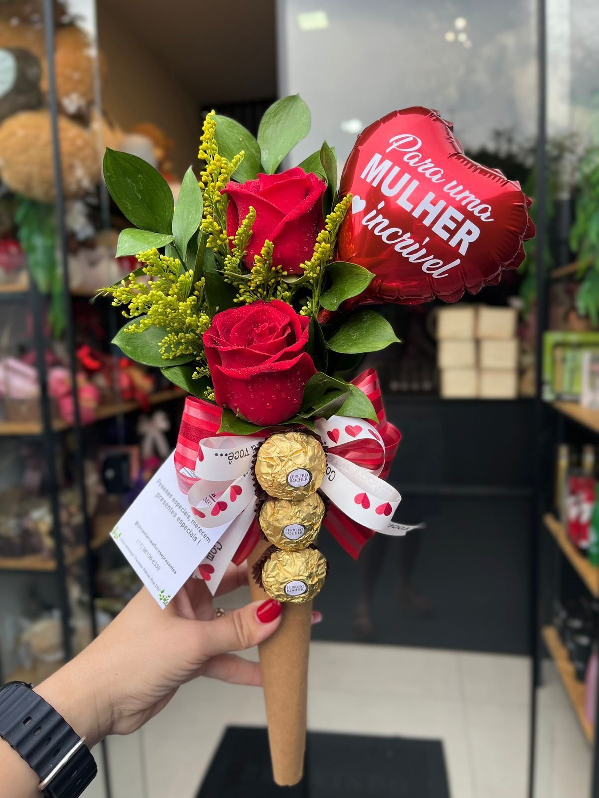 Este arranjo contém: 2 rosa, Ferrero Rocher e mini balão.