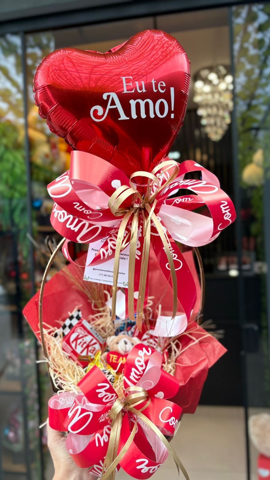 Mini cesta muito linda, com chocolates variados e balão grande personalizado.