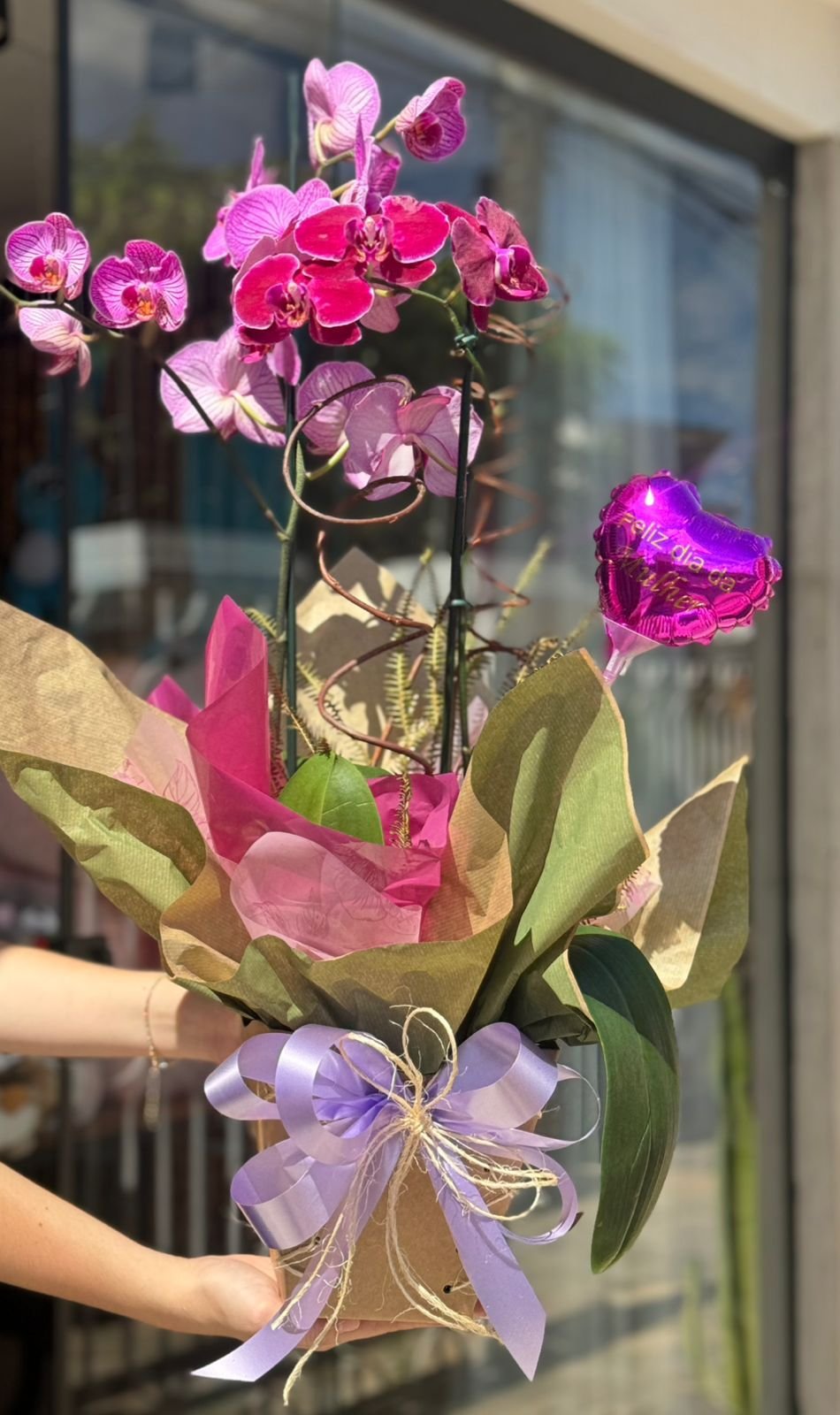 Este arranjo contém: Orquidea e mini balão personalizado.